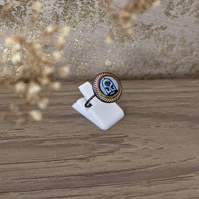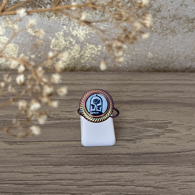 Cette bague taille unique et réglable met en valeur un print de cyanotype "rose éternelle ".