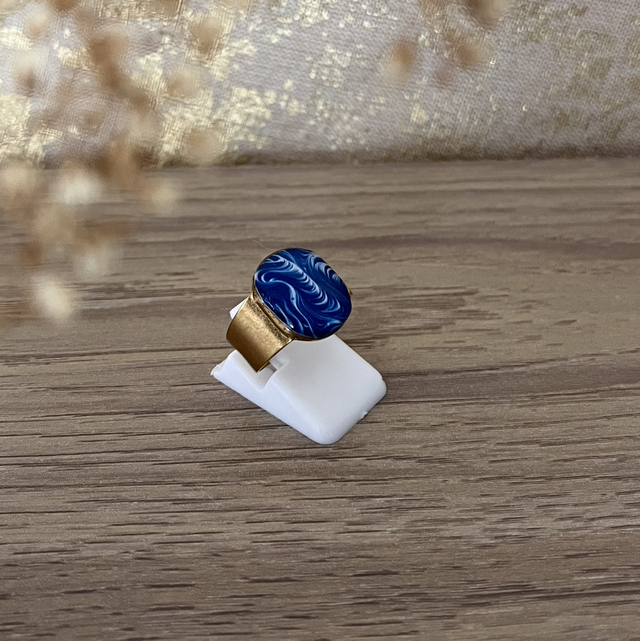Cette bague taille unique et réglable met en valeur un print de cyanotype "motif ".