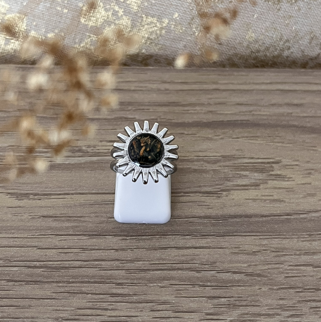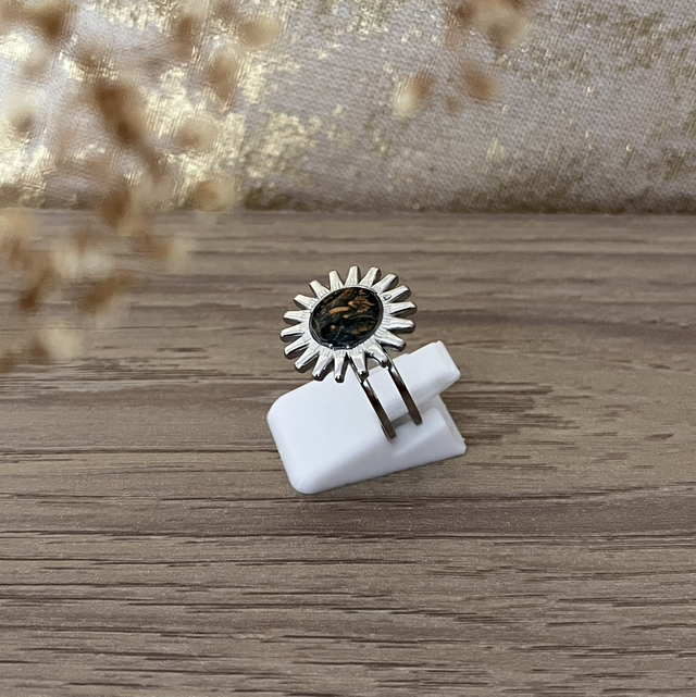 Cette bague taille unique et réglable met en valeur un print de cyanotype "dragon ".