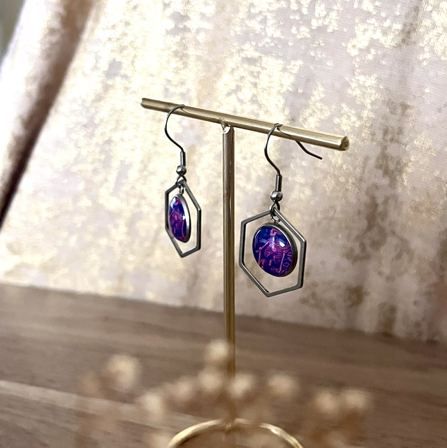 Ces boucles d’oreilles mettent en valeur un print de cyanotype "squelette ".