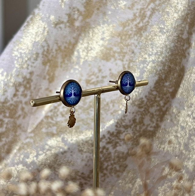 Ces boucles d’oreilles mettent en valeur un print de cyanotype "Arbre de vie ".