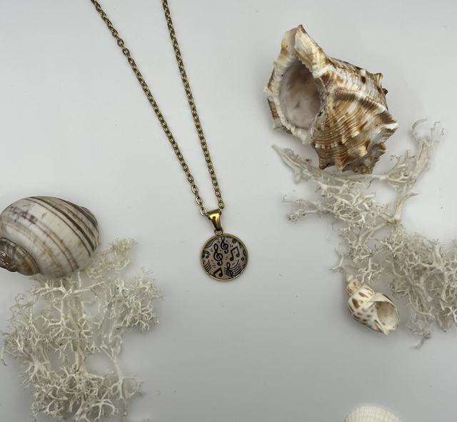 Ce collier met en valeur une reproduction de cyanotype "musique".