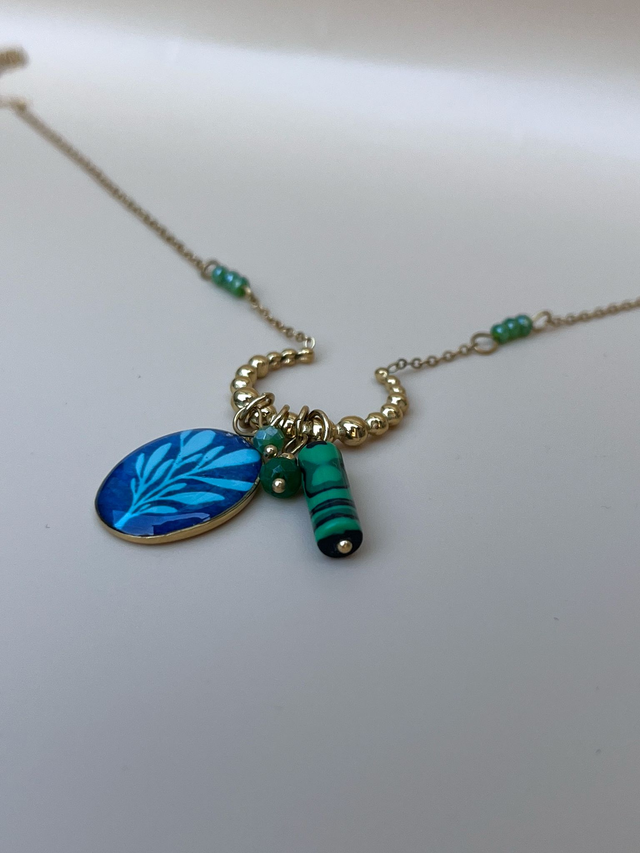 Ce collier de perles met en valeur une reproduction de cyanotype "Feuilles".