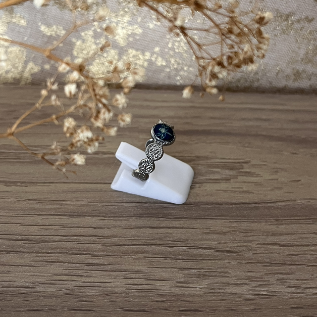 Cette bague taille unique et réglable met en valeur un print de cyanotype "libellule ".