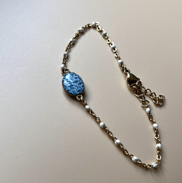 Ce Bracelet en chaine met en valeur une reproduction de cyanotype "musique".