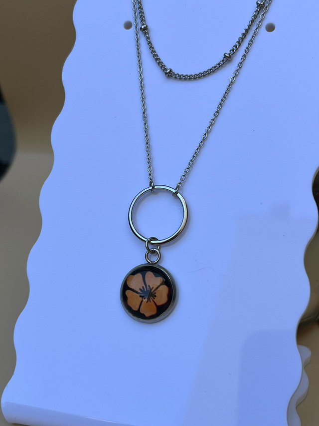 Ce collier double chaine met en valeur une reproduction de cyanotype "Fleur".