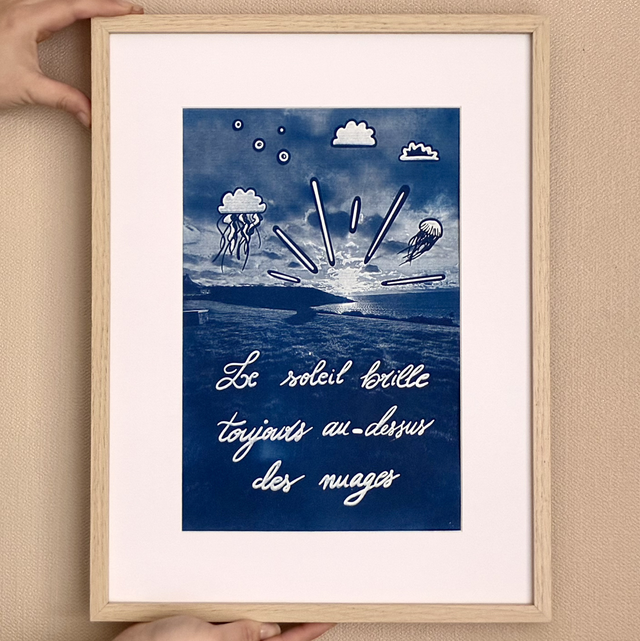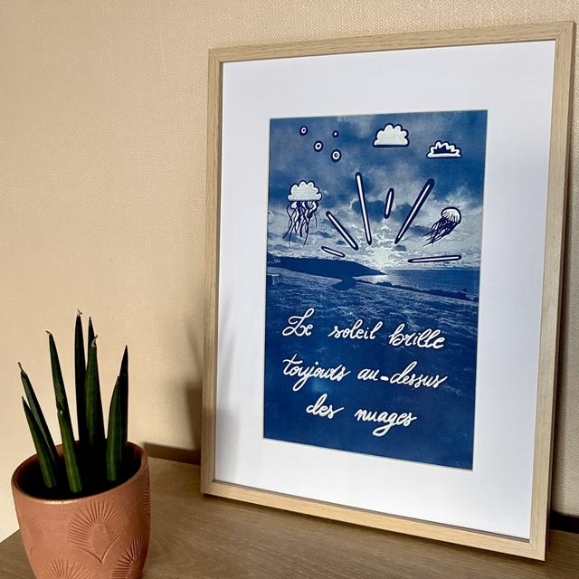 J’ai créé la série « Brille sans limite ✨ » pour apporter une touche de positif dans nos vies ! Entièrement inspirée par l’univers de l’épanouissement personnel, cette collection a pour objectif de vous offrir de belles images en cyanotype, parfaites pour décorer vos intérieurs. Chaque fois que vous passerez devant elles, vous pourrez lire une phrase positive et vous rappeler que tout est possible ! Mon souhait est d’apporter un peu plus de bonheur et de lumière à votre quotidien grâce à ces images.